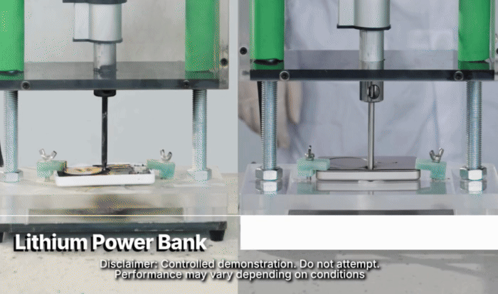 When a lithium battery is drilled, heat builds until the liquid inside ignites and catches fire.